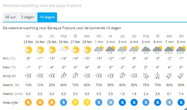 De voorspelling van het KMI zelf is gebaseerd op Brussel. Volgens het KMI wordt donderdag 1 maart 2018 de koudste dag, het wordt dan op z’n koudst tussen de 6 en 10 graden onder nul. In Brussel. Het kan in de Hoge Venen best een graad of 4 a 5 kouder zijn. Een verschil van meer dan 7,5 graden ligt niet direct voor de hand. Afgaande op het KMI kun je dus het beste inzetten dat het ‘warmer dan -17,5 graden’ wordt.